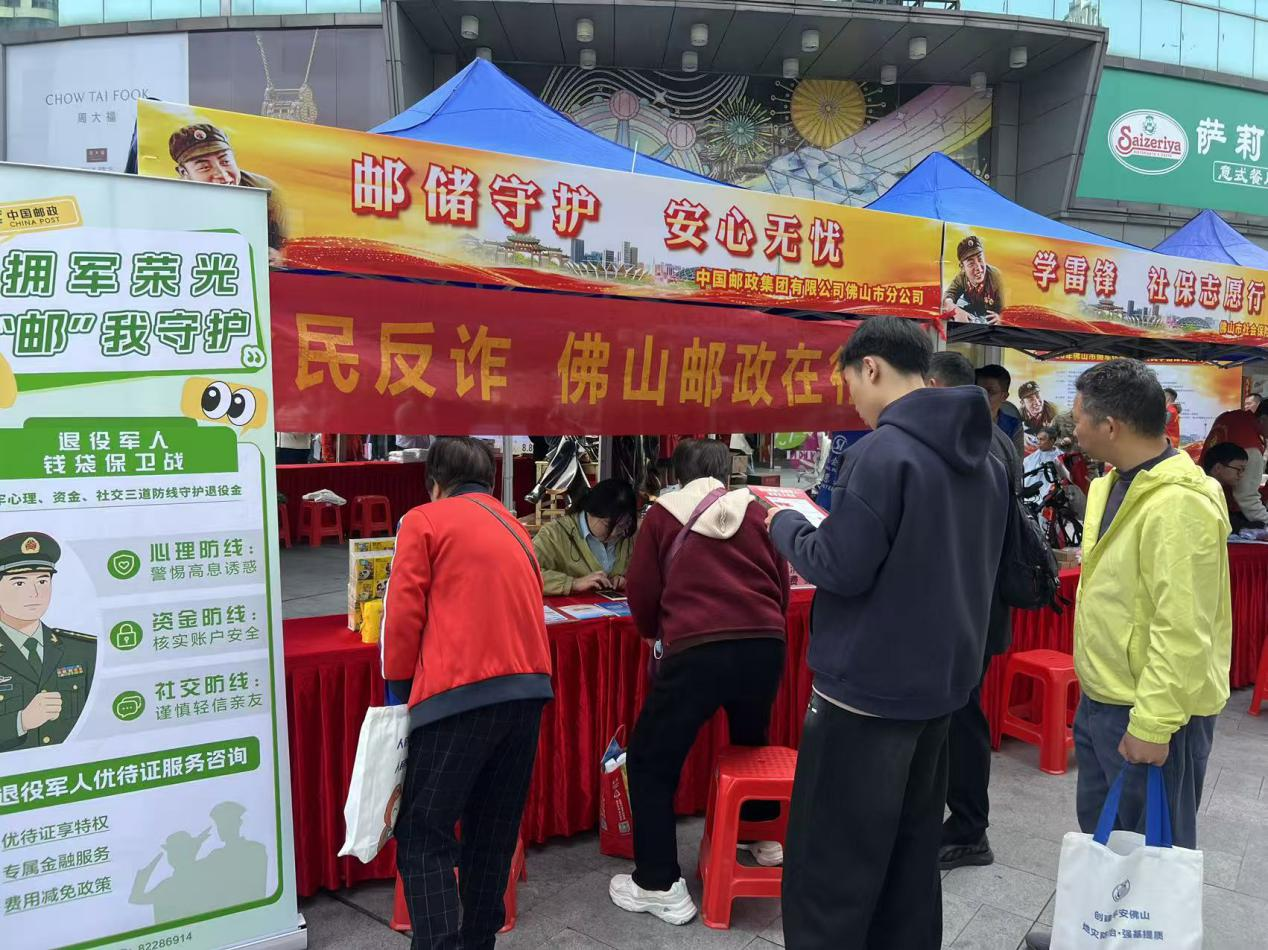 在 2026 年学雷锋志愿服务日当天,邮储银行佛山市分行携手邮政集团城区分公司,积极联动佛山市退役军人事务所,共同开展主题志愿服务活动。活动现场设立了“邮储守护,安心无忧” 宣传咨询摊位,悬挂着“全民反诈,邮政在行动”横幅,摆放“拥军荣光,‘邮’我守护”易拉宝,布置醒目、内容丰富,营造出浓厚的反诈宣传氛围。