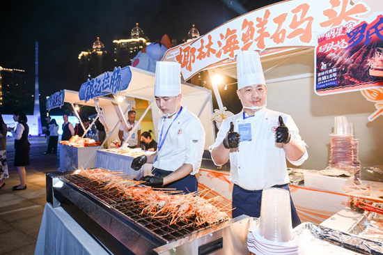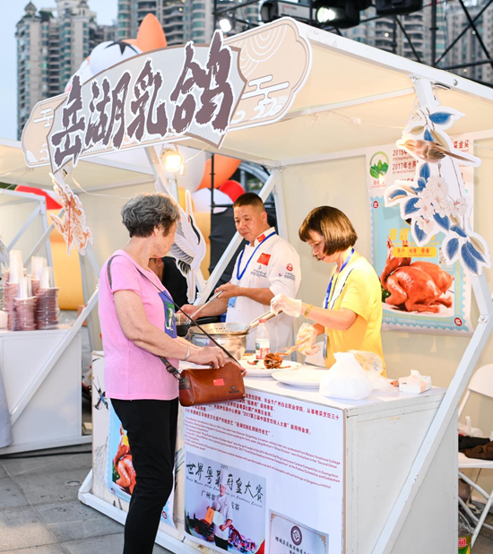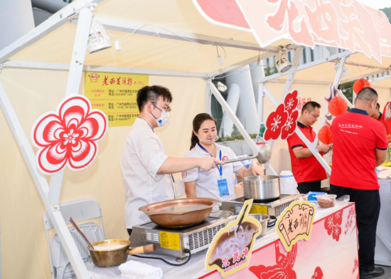 非遗美食区则集结了多个特色摊位,可供嘉宾们免费品尝。银记拉肠米香扑鼻,岳湖乳鸽红亮诱人,老西关水菱角软糯可口,黄埔华苑蝴蝶酥层层酥脆,赞记礼饼馅足味香,椰林海鲜码头供应的罗氏虾则肉质弹嫩,与其他地标美食共同构成舌尖上的岭南风味。