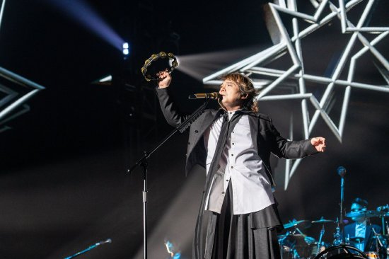 果然,这份自信的音乐态度在开场便展露无遗。他没有选择讨好耳朵的热歌暖场,而是以《上瘾了》《风火》《黄色月亮》三首冷冽、迷幻又带些怪诞的硬派摇滚作品开篇,失真的吉他音墙与强劲鼓点瞬间击穿全场,配合大屏幕上光怪陆离的视觉风暴,将观众拉入专属于伍佰的独特摇滚美学世界。