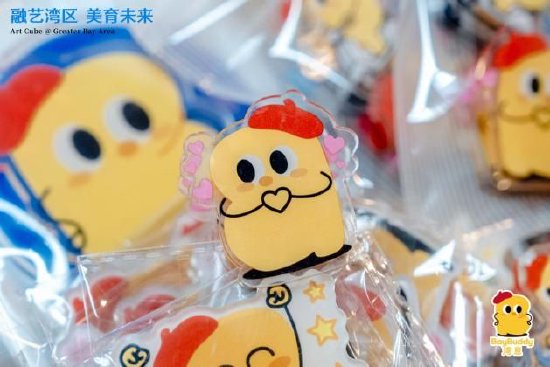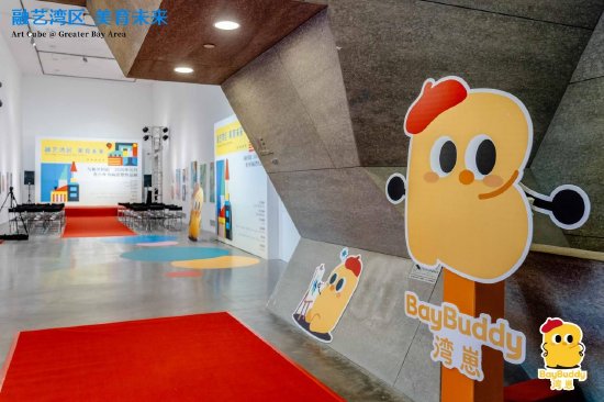 展览特别设计了专属IP形象 “Bay Buddy 湾崽”,该形象以粤港澳大湾区英文简称“Bay”的首字母“B”为设计原型,以明黄色象征湾区青少年的活力与创造力,配以红色艺术帽展现艺术探索精神。“湾崽”不仅是展览的视觉标识,更是湾区美育理念的温暖载体——它以伙伴之姿陪伴青少年艺术成长,以开放包容的姿态连接湾区各地文化,生动诠释了“美育未来”的核心理念。