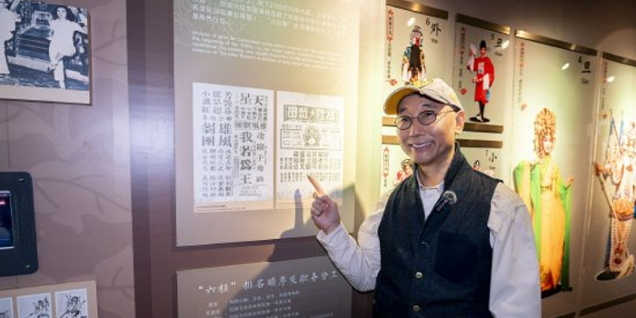 在粤剧艺术博物馆,卢冠廷指着父亲卢海天的名字拍照