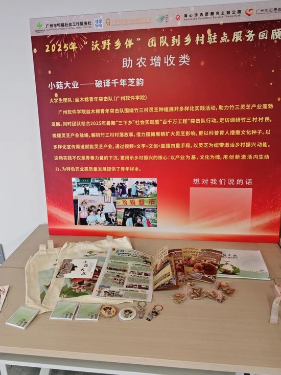 其中,荣获一等奖的“小菇大业—破译千年芝韵”项目已成功入围两届“沃野乡伴”大学生农村服务公益微创投项目,两年来,团队紧扣地方特色资源,将传统灵芝文化与现代创意深度融合。起初,项目仅在理念与调研层面探索乡村文化的可能性,如今已成功打造出一系列具有鲜明文化内涵的文创产品,涵盖包装设计、衍生纪念品及体验课程等多个类别,真正做到了从创意构想到落地运营的闭环。