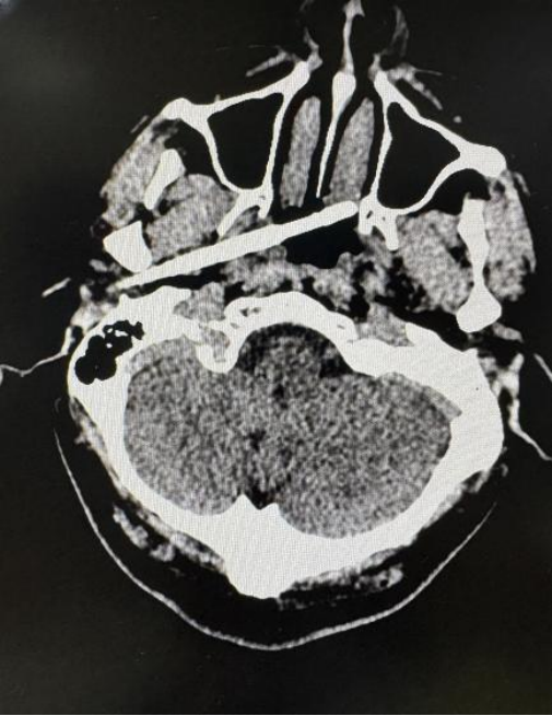 东莞45岁男子在与人争执时,一根筷子从耳部插入颅底,筷子被折断,断端残留体内。更令人揪心的是,筷子不仅穿透了耳部骨质,筷子尖端距离颈内动脉仅5毫米——这是大脑供血的主干线之一,一旦破裂,可导致瞬间大出血死亡。