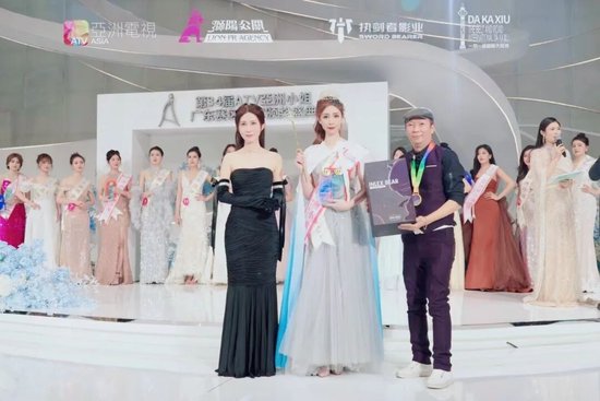 亞组委广州副主席牛哥(左)、2018亞姐广州冠军周熙金(右)为16号刘东娜颁发【2023亞洲小姐深圳赛区冠军】