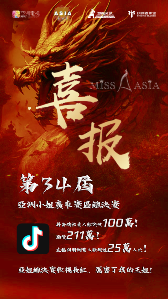 亞洲小姐广东赛区杨振业主席(上图中)也在接受采访时指出:在组委会的巨资投入和高效运作下,ATV亞洲小姐赛事火遍全国,培养出一届又一届高素质的知名佳丽,打造出充满吸引力的赛事生态!在亞姐赛事焕发新机的背后,离不开广大公众的支持和知识产权的保护。希望各界一起联手打击盗版亞姐赛事,为这一项全国独家的粤语选美大赛IP,保留一片纯洁的净土。寄语某些不法商人,尊重法纪、停止碰瓷。