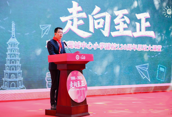 活动上,李汉容代表莞城街道向莞城中心小学建校120周年表示祝贺。他肯定了莞城中心小学自创办以来坚持“悦纳至正”办学理念,深耕立德树人,获评全国文明校园等多项荣誉,为莞城教育高质量发展作出的积极贡献。李汉容表示,此次“走向至正”思政大课,将百年校史与文化传承深度融合,进一步丰富了“学在莞城”城市名片内涵。未来莞城将坚持教育优先发展战略,加大教育投入、深化教育改革,全力支持学校建设发展。希望莞城中心小学以建校120周年为新起点,坚守育人初心、提升办学质量,助力莞城教育发展。