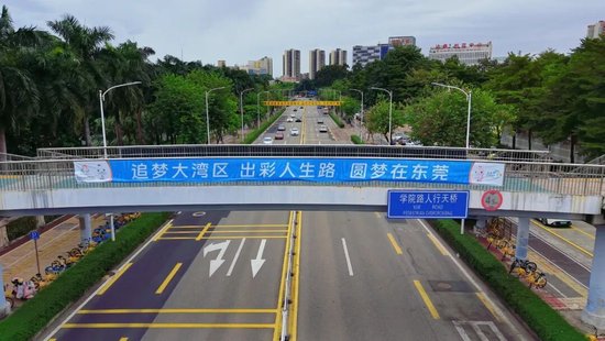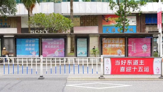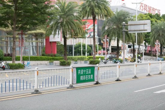 不仅道路两旁灯杆旗迎风而立,莞城还巧妙利用辖区内人行天桥及路边护栏,悬挂起一系列十五运会宣传横幅。一句句振奋人心的话语,配合一幅幅动感十足的画面,让天桥与护栏化身为宣传盛会的重要窗口,将全运气息悄然融入市民的日常动线。