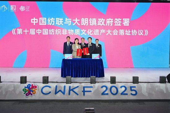 中国纺织非物质文化遗产大会是由中纺联主办的国内唯一国家级纺织非遗品牌盛会,是纺织非遗传承发展、成果交流的行业性最高平台。在“织交会”开幕式上,中国纺织工业联合会与大朗镇政府共同签订了《第十届中国纺织非物质文化遗产大会落址协议》,正式确定双方将于2026年6月联合举办第十届中国纺织非物质文化遗产大会,会址落地大朗。