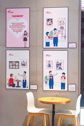 餐厅里特别的艺术作品展示墙,吸引了不少顾客关注。丰富的色彩搭配、富有想象力的艺术作品,这正是肯德基餐厅为“天使”们特别打造的 “天使共融空间”,帮助拥有艺术梦想的残障人士获得更多展示自我的机会。