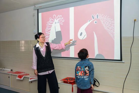活动现场,谢老师首先为孩子们系统讲解了版画的悠久历史与丰富种类,用生动有趣的语言拆解版画艺术的起源、不同版画种类及其艺术特点,让孩子们对这门古老技艺有了清晰认知。随后,结合新年的习俗,老师重点介绍了我国历史悠久的木板年画,详细讲解了最具代表性的四大年画:天津杨柳青、苏州桃花坞、潍坊杨家埠及四川绵竹,及不同地区的年画特色。讲解中老师不时抛出问题,孩子们积极思考,踊跃发言,在轻松欢乐的氛围中感受传统文化的美学知识。