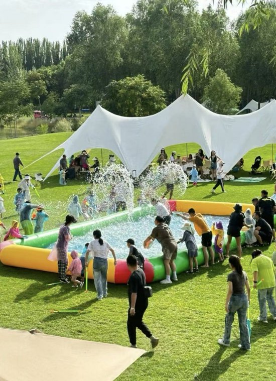 草坪营地变身夏日玩水乐园,水枪水瓢互动畅玩,傍晚开启星空电影模式,席地而坐、晚风相伴,解锁露营休闲新方式。