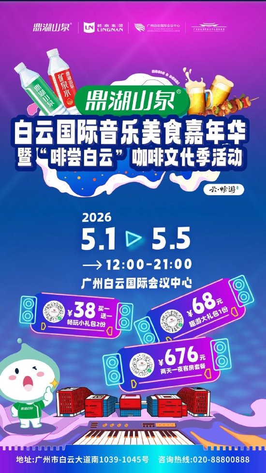 关注2026年5月1日至5日,“鼎湖山泉 · 白云国际音乐美食嘉年华暨‘啡尝白云’咖啡文化季活动”将在广州白云国际会议中心盛大举行。本次活动作为广州咖啡文化季白云分会场,以“音乐+美食+咖啡+露营+演出”多元融合为核心,打造五一假期城央微度假新地标。