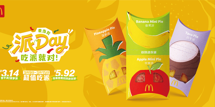 关注(2026年3月9日,广州)麦当劳中国宣布正式开启第十二届“派Day”。 即日起至2026年3月15日,麦当劳派Day以“心想派成,吃派就对”为主题,倾听粉丝呼声,在超值吃派传统之外,更以全新“双拼迷你派”形式,让苹果派与香蕉派惊喜返场,实现一次品尝两款人气口味的愿望。派Day期间,顾客可以最低3.14元的价格选购经典香芋派、菠萝派等多款派产品。与此同时,为打造更具仪式感的节日体验,麦当劳在社交媒体上收集了粉丝对派产品的真挚反馈与热爱,并将真实“吃派心声”融入产品包装并覆盖多个城市的户外广告中,通过多种形式共同庆祝这一与粉丝双向奔赴的年度品牌节日。