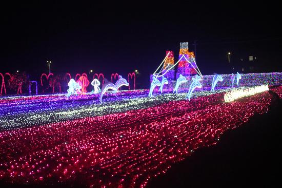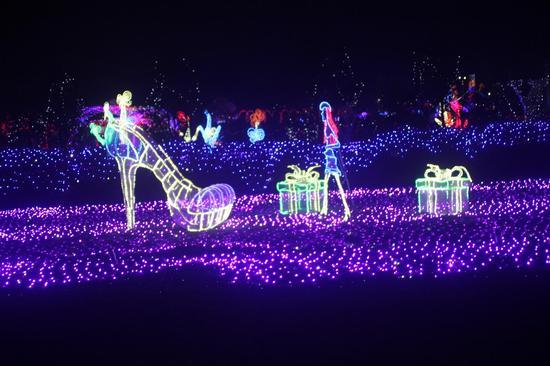 大埔围花海近4万平方米的园区被划分为12个主题展区,用不同颜色的灯饰进行点缀, “时光隧道”、“水晶高跟鞋”、“绚丽富士山”、“心形爱情通道”、“七彩隧道”……富士山由5万盏灯组成,近5米高。