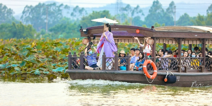 江门华侨城古劳水乡景区推出“横海游梦”6公里游船项目,游客可泛舟河上,欣赏水乡秀丽风景,并在观赏行进式演艺“去赶圩、去渔耕、去展艺”的过程中感受水乡生活的惬意闲适。