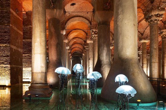 伊斯坦布尔处处是历史。在伊斯坦布尔,天空的轮廓线不属于摩天大楼,而是属于宣礼塔。每当黎明、正午、午后、日落和夜晚,从这些塔尖的喇叭中流淌出的宣礼声,在整个城市的上空回荡、交织,召唤人们进行礼拜。这不是噪音,而是一首跨越千年的城市交响曲。最引人注目的宣礼塔就在阿亚索菲亚大清真寺、蓝色清真寺等标志性建筑间,它们见证了这座城市宗教的辉煌与变迁。而在地下,东罗马帝国皇帝查士丁尼一世于公元532年左右下令修建地下宫殿内,藏着著名的美杜莎浮雕和“眼泪之柱”,这是世界上现存最大、最壮观的古代地下水库之一,堪称古代工程学的奇迹。上天入地间,都能找寻到伊斯坦布尔历史的印痕。