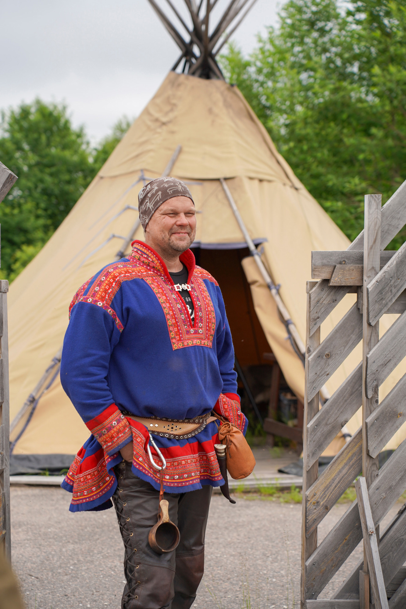 杯子制作完毕,主理人引我们移步工坊旁的帐篷。帐外天光正好,帐内柴火正旺,我们围炉而坐,看壶中的咖啡在熊熊火焰下翻滚蒸腾。我们用刚完成的这只犹带木香的杯子,盛满滚烫的萨米咖啡,浅尝一口,一股独特的滋味便在舌尖绽放——比普通咖啡更为醇厚,当中还藏着一缕微咸的底蕴,仿佛将拉普兰的风雪与大地的气息,也一并融入了其中。