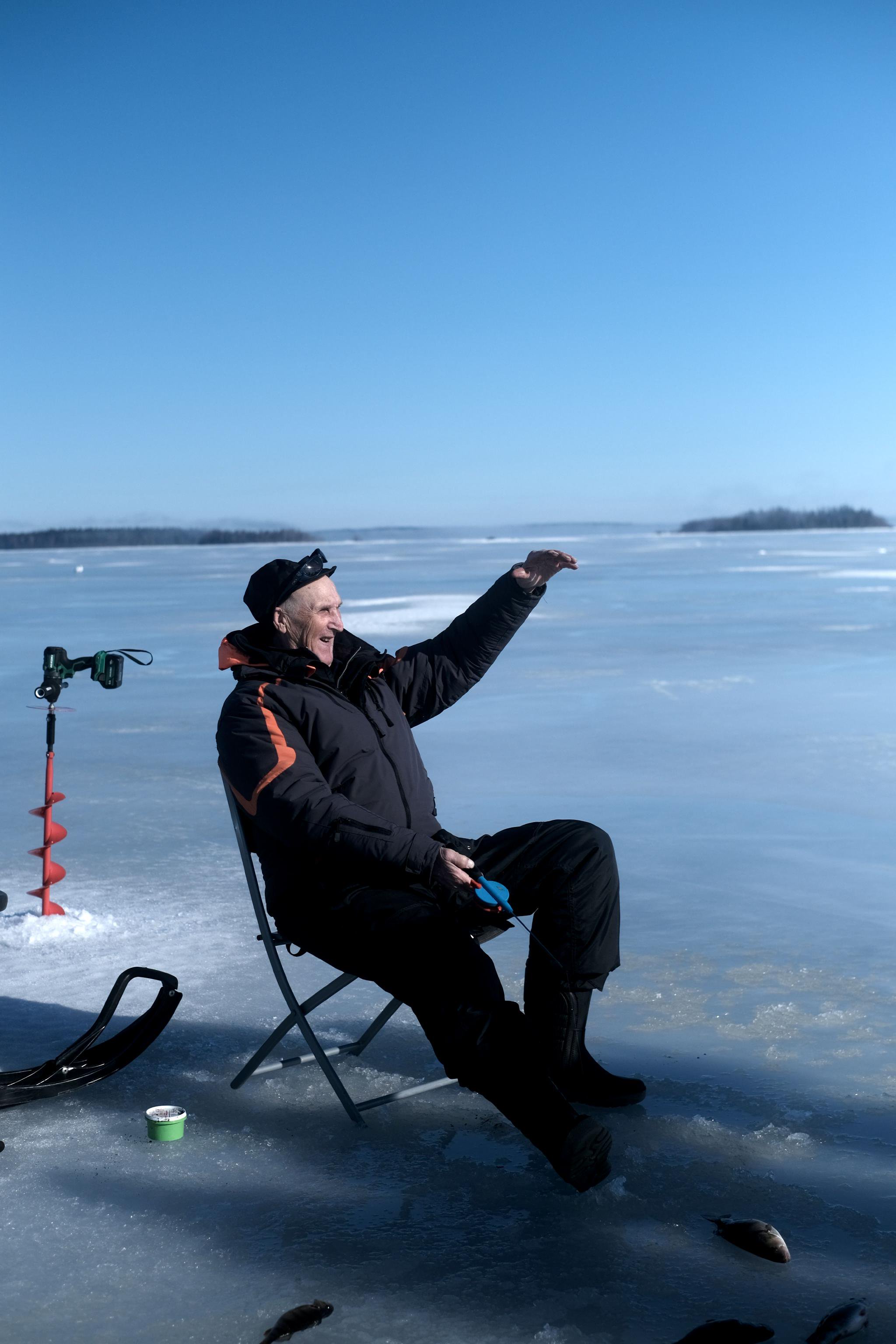 不一会儿,眼前出现了一对老夫妇,他们正悠闲地冰钓。只见那位老先生正俯身在一个冰洞旁,手中握着一根极短的钓竿,手腕灵巧地一抖一提,动作柔和而富有韵律,仿佛正与冰层下的世界打着某种心照不宣的节拍。他的妻子安静地坐在一旁的雪地摩托车上,不时提着鱼竿,脸上带着平和的笑意。两人前方的冰面上已铺满生猛鱼获,身后则竖着一把用于钻钓洞的电动冰钻。在瑞典,冰钓是备受人们喜爱的活动,拥有漫长冬季的拉普兰地区更是冰钓天堂,可以钓获鲈鱼、白鱼、褐鳟等丰富鱼类。