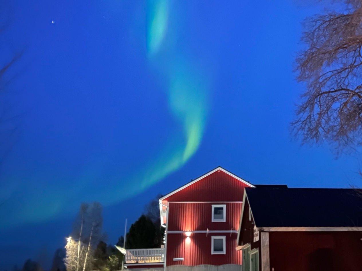 2025是太阳活动周期的峰值年,这意味我们处于“极光大年”之中。即便在开春之后,天空依然不舍谢幕,仍有机会连续多个夜晚与极光不期而遇。在拉普兰停留的四晚里,我们有三个夜晚都看到了极光,追光的足迹遍及山野之上、冰海之畔,甚至有一次,那流转的绿光就轻盈地飘荡在我们民宿的木屋前。
