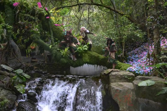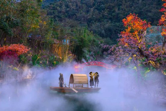 转身却是另一重梦境:红桥之上,汉服少女衣袂翩然,仿佛从古画中走来;浅滩处鸟啼偶起,蛙声轻和;载满鲜花的小舟顺流而下,芬芳随风飘近又远去。这里,你可伸手触摸滴水的蕨叶,可俯身观察游鱼的轨迹,可仰头迎接彩虹水雾,也可静静伫立,成为这幅“水墨雨林”中自然的一笔。