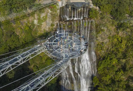 第二幕:瀑布蹦迪,和水雾一起飞。穿过静谧的雨林步道,便抵达45米宽的万丈崖大瀑布,瀑布旁的野人部落依山傍瀑而建,“原始野人”在此上演一场极具原始野性的部落舞蹈,瀑布飞泻而下的轰鸣声,成为部落舞蹈的天然背景音,演员的身姿随着节奏舒展、跳跃,将部落的热情与豪迈展现得淋漓尽致,水雾漫过舞台,光影交错间,仿佛穿越回原始丛林部落的狂欢盛宴,游客可驻足观赏、拍照打卡,还会被演员邀请上台,一同起舞,沉浸式感受部落文化的魅力。