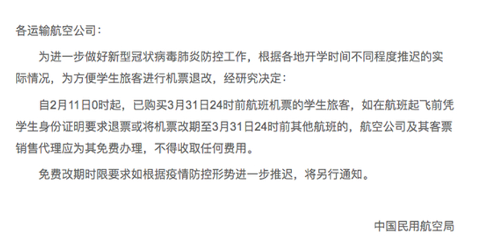 关注据民航局网站消息,为进一步做好新型冠状病毒肺炎防控工作,根据各地开学时间不同程度推迟的实际情况,为方便学生旅客进行机票退改,民航局要求,自2月11日0时起,在该时间点之前已购买3月31日24时前航班机票的学生旅客,如在航班起飞前凭学生身份证明要求退票或将机票改期至3月31日24时前其他航班的,航空公司及其客票销售代理应为其免费办理,不得收取任何费用。